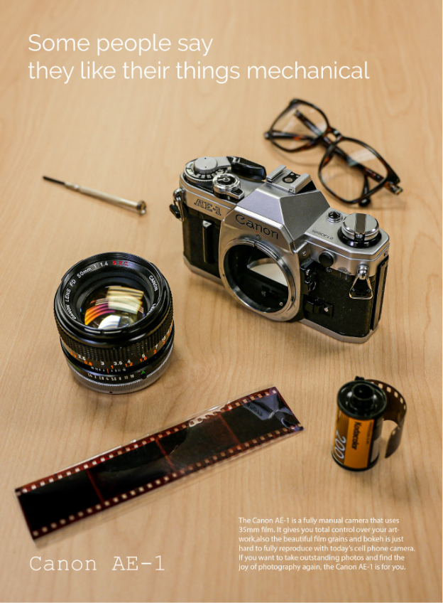 This project is a series of advertisement photographs I created in a photography class. The goal was to promote the Canon AE-1 film camera to three different target audiences: readers of Time, People, and Wired. I was interested in exploring how the same product could be communicated in different ways depending on the audience, and how visual style can shift the message while maintaining a consistent product identity.